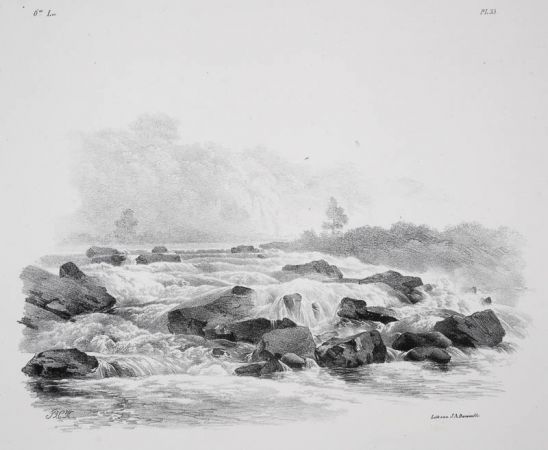 Landschaftsstudien / landschapstudies; schnell fließender Fluss mit Wasserfällen; 33. Blatt von 59 Lithographien.