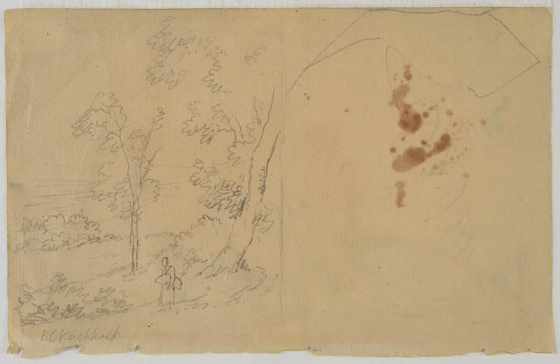 Skizzenbuchblatt: Hügelrand mit zwei Bäumen und einer wandernden Frau.