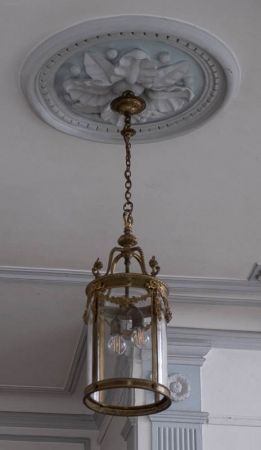 Hängelampe in Laternenform, rund, an vier gebogenen Trägern aufgehängt; Girlandenschmuck am oberen Rand der Laterne.