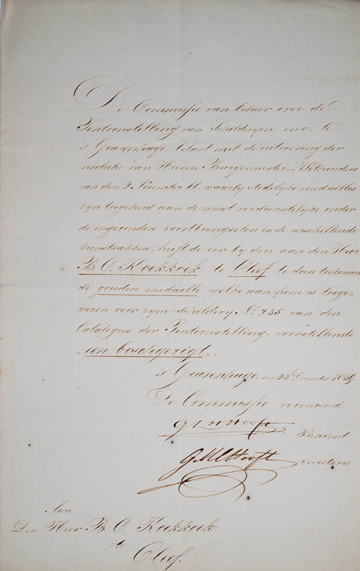 Verleihung der Goldmedaille für Gemälde "een bosgezigt" - "eine Waldszene", 23. Dezember 1839.