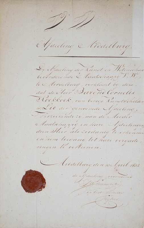 Nachweis der Mitgliedschaft für die V.W. Gesellschaft für Kunst und Wissenschaft, Abteilung Middelburg an B.C. Koekkoek, ausgestellt am 13. April 1832.