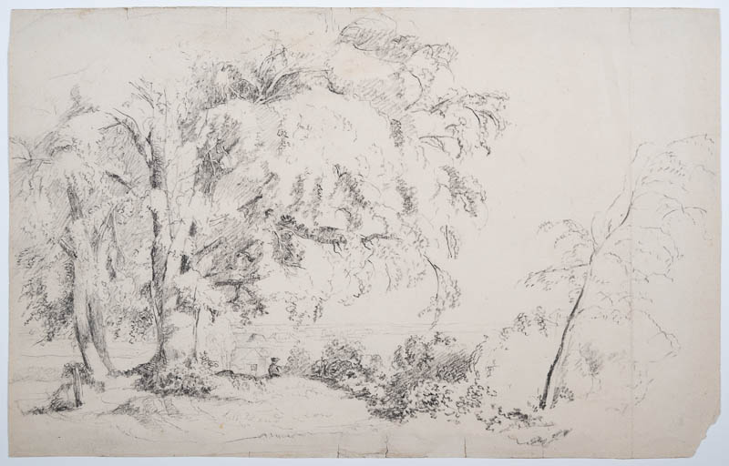 Hügelrand mit großen und kleineren Bäumen, von wo aus man einen Blick hat auf Flachland mit Häusern; eine Person sitzt mittig im Vordergrund.