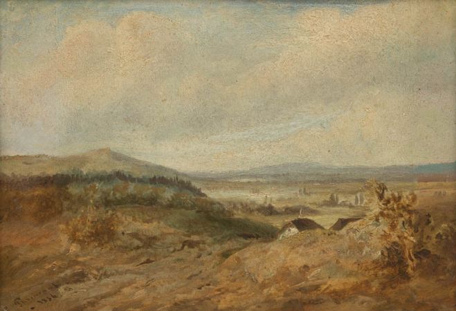 Hügellandschaft mit zwei Bauernhöfen rechts.
