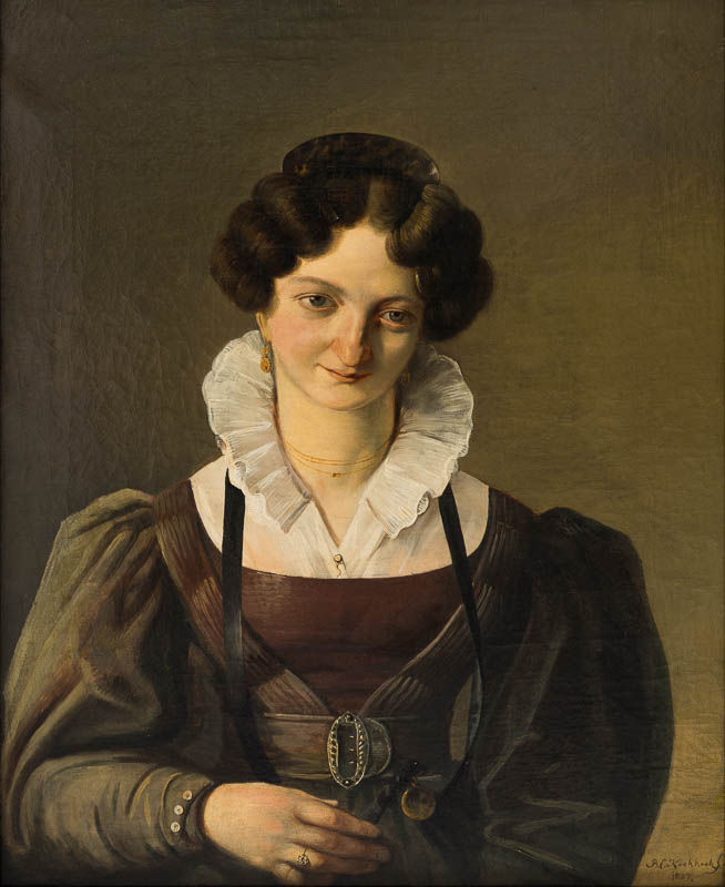 Brustbild von vorne mit leicht geneigtem Kopf; das braune, gewellte Haar mit Perlmuttkämmen aufgesteckt, den weißen Kragen hoch aufgeschlagen; möglicherweise Anna van Koolwijk, die Mutter des Malers.