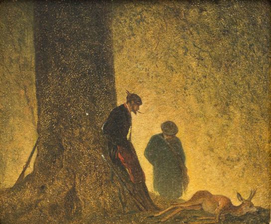 zwei Jäger bei einem Baumstamm, ein totes Reh betrachtend.