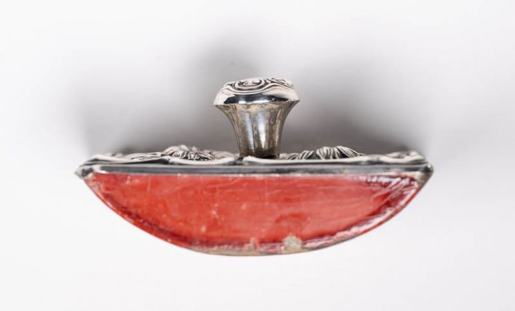 Löschblock aus rot lackiertem Holz mit Silberbekleidung an der Oberseite; im Relief Rokoko Rand mit zwei Sonnenblüten; kleiner Knopf mit Rokoko Ornament.