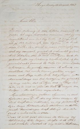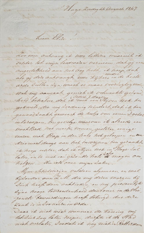 Ein Brief von B.C. Koekkoek an seine Frau Elise, 22. August 1847; In dem Brief wird auf zwei Seiten u.a. der Gesundheitszustand von ihm (Nackenschmerzen) und seiner Frau (etwas in den Augen), der Besuch beim König und die Erlaubnis, bald nach Hause zu kommen und seine Frau und Kinder wiederzusehen, beschrieben.
