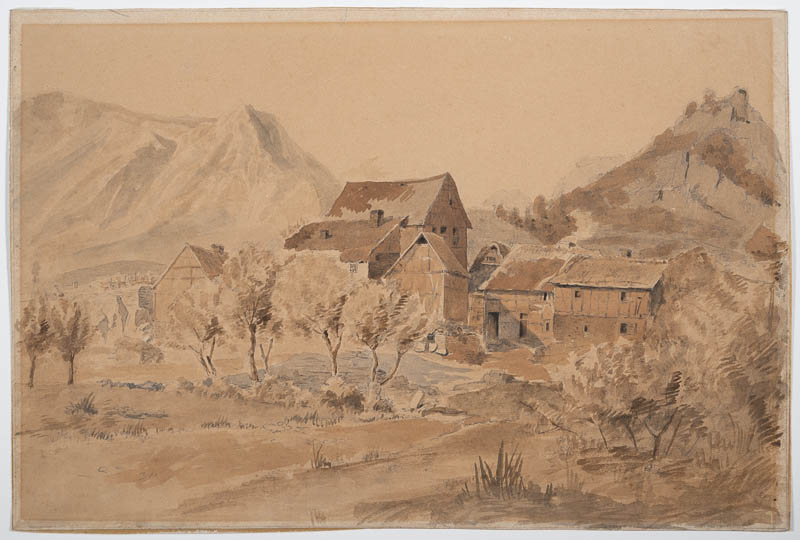 Häusergruppe oder kleines Dorf in Felsenlandschaft; links und rechts steile Hügel, auf dem felsigen Hügel rechts steht eine Schlossruine.