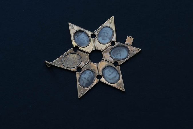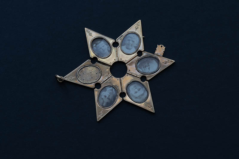 Rautenförmiger Anhänger, ausfaltbar zu einem sechs-eckigen Stern, worin sechs Ovale für Fotografien; hierin befinden sich fünf kleinen Porträtfotografien von Herrn und Frau Mentrop-Esser und drei ihrer Kinder.