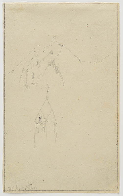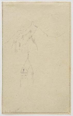 Skizzenbuchblatt: Kirchturmdetail im Vordergrund mit Gebirgszug im Hintergrund.