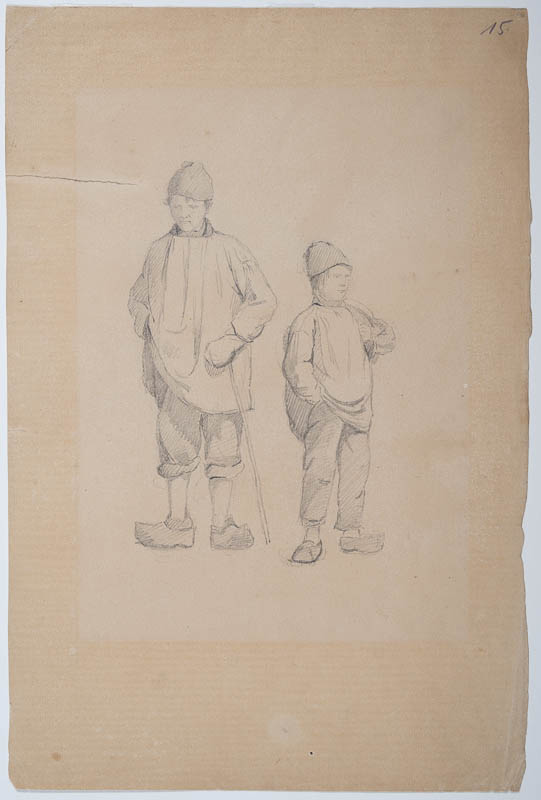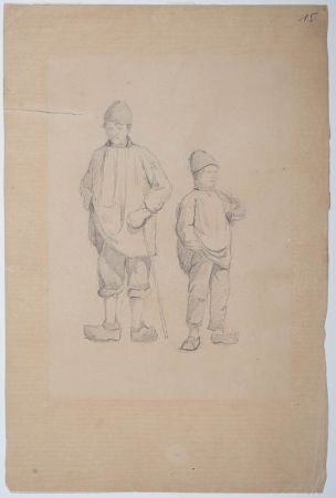 Bauer und Sohn, nebeneinander stehend; beide mit Mütze und Holzschuhen.