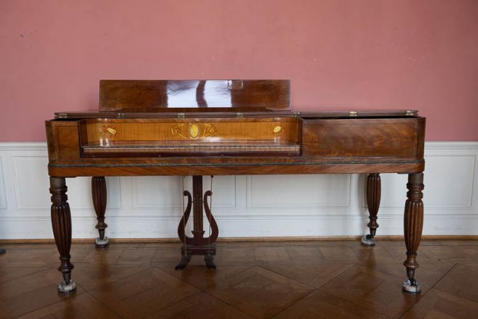 Tafelklavier auf vier kanalierten Beinen mit Rädern; dekoriert mit bronzenem Rand.