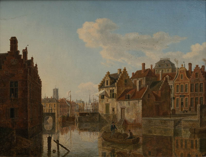 Ansicht einer niederländischen Stadt mit Grachten; im Vordergrund rechts ein mit zwei Personen bemanntes Boot, das Fässer transportiert.