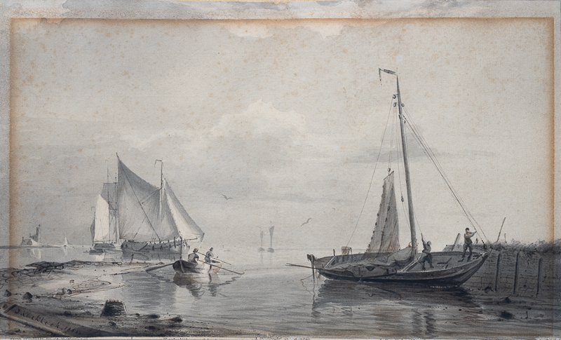 2 Segler vor Hafeneinfahrt; auf dem vorderen Segelboot holen zwei Mariner die Segel ein; zwei Ruderer im Boot fahren auf die offene See.