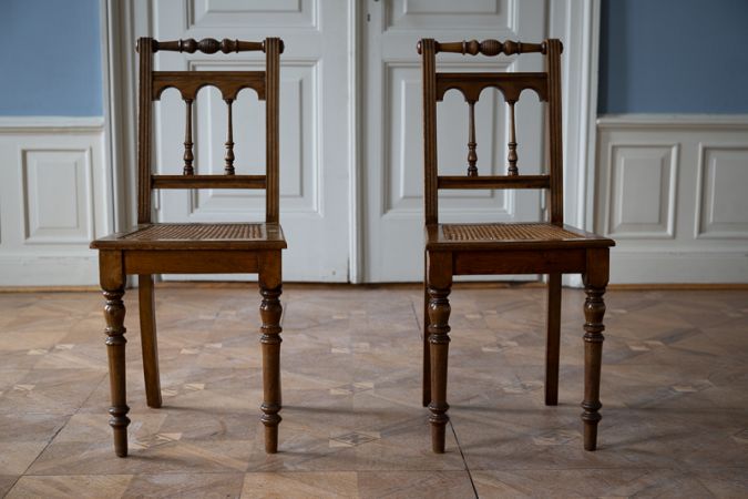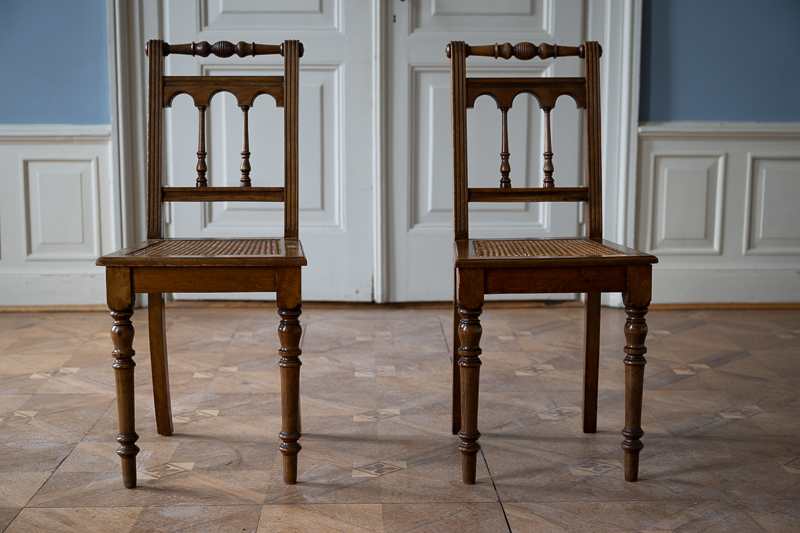 Zwei Stühle mit gedrechselten Vorderbeinen; Rückenlehne mit Bogenmotiv und gedrechselten Säulchen, gedrechselter Abschluss oben; Sitzfläche mit Bastgeflecht; Frankfurt am Main.