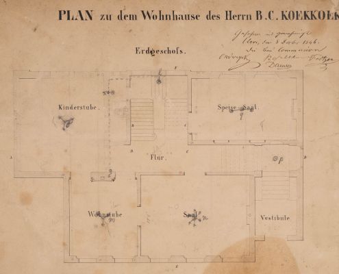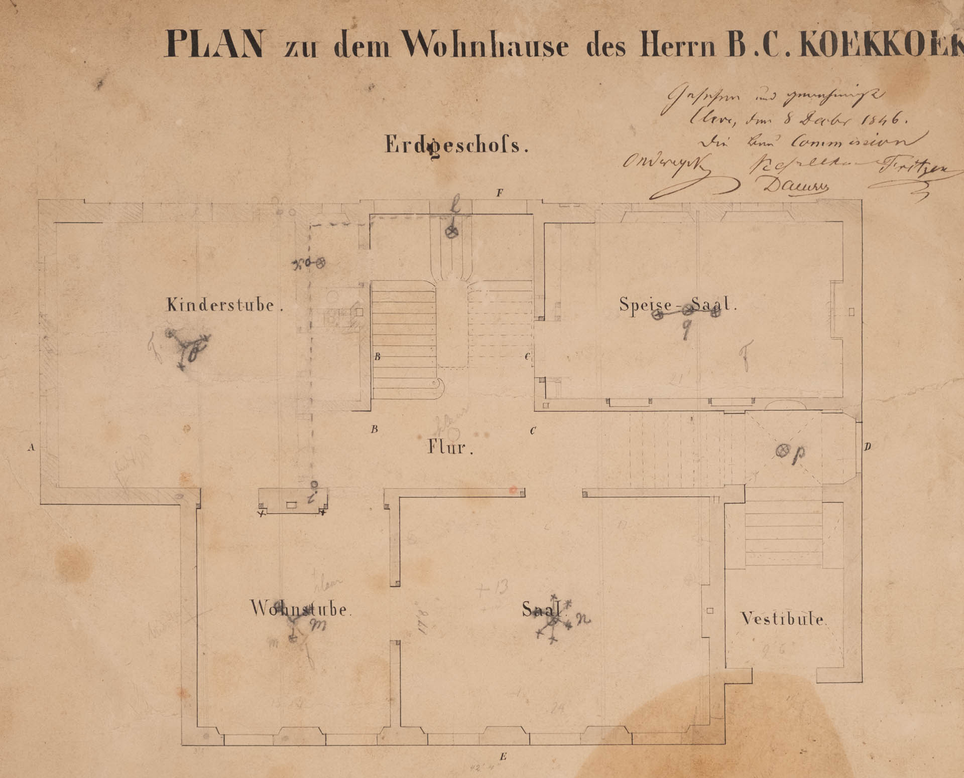 Der Grundrissplan aus dem Jahr 1846 ist erhalten. Gezeichnet hat ihn der damalige Architekt und Bauleiter Franz Ludwig Pelzer: „Plan zu dem Wohnhause des Herrn B.C. Koekkoek zu Cleve. Entworfen von A. Weinhagen gez. von Fr. Pelzer 1846.“ Bis zum Ende der Bautätigkeit dauert es drei Jahre: Aus September 1849 datieren die letzten Rechnungen.