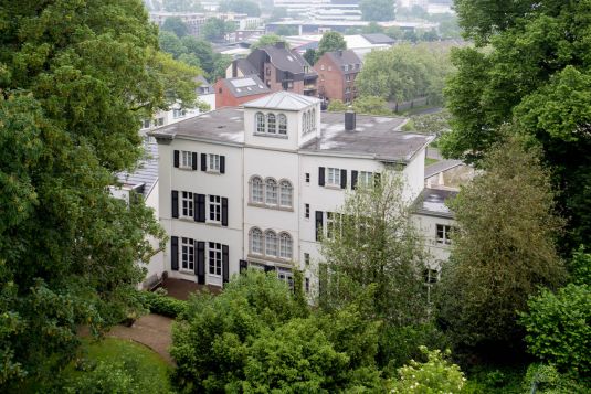 Die Fassade der Gartenseite ist im Stile eines italienischen Landhauses schlichter gehalten. Sie wird vertikal strukturiert mit den großen dreiteiligen Fenstern des Treppenhauses in der Mitte und den flankierenden Fenstern der Geschosse. Links und rechts ist die Fassade eingerahmt von zwei großen vertikal durchgehenden Pilastern.