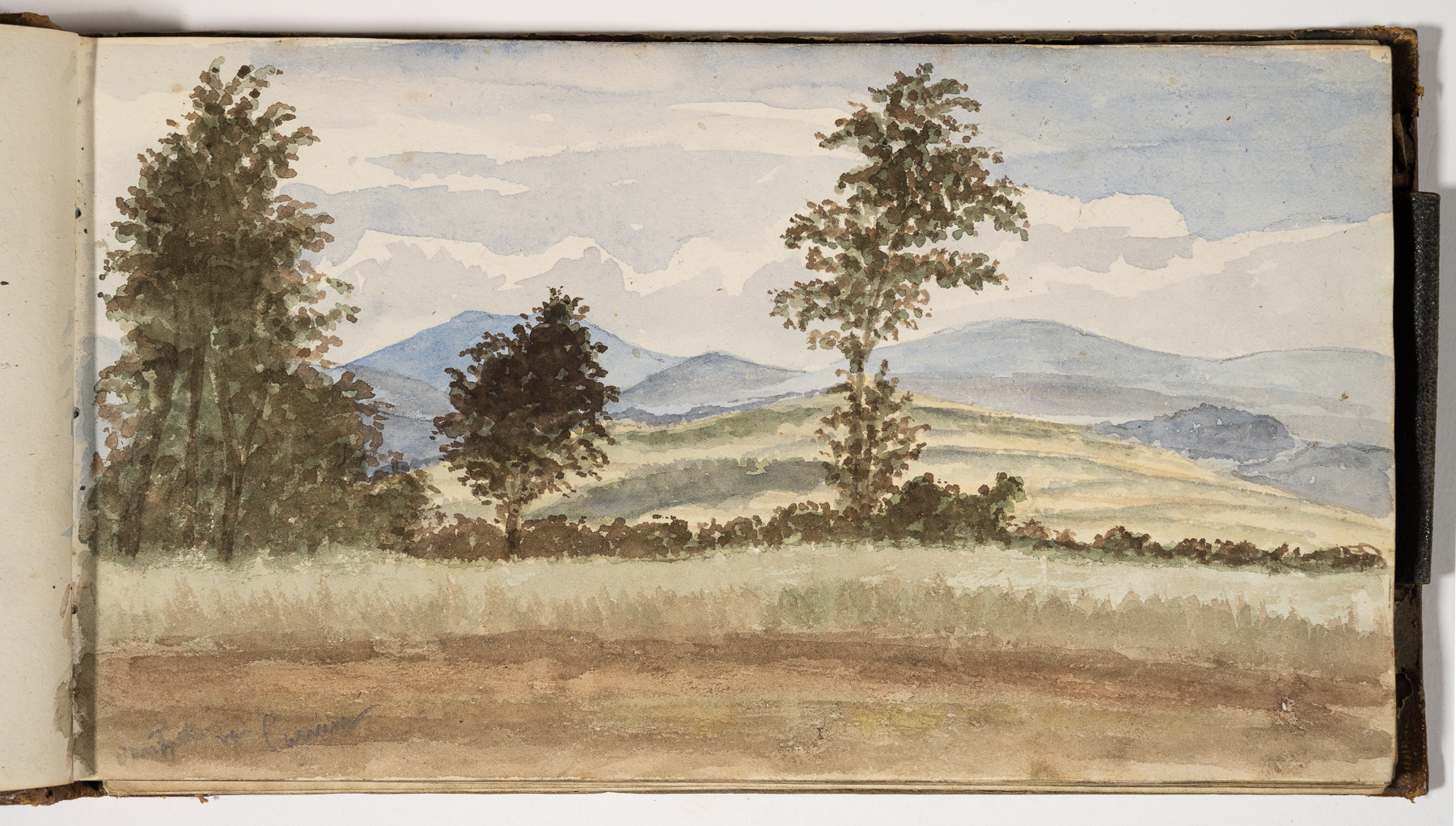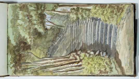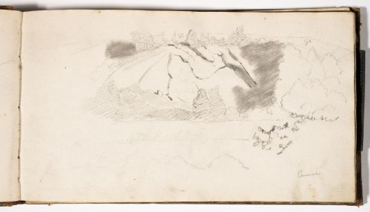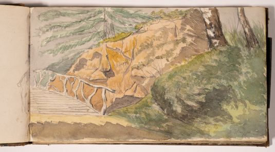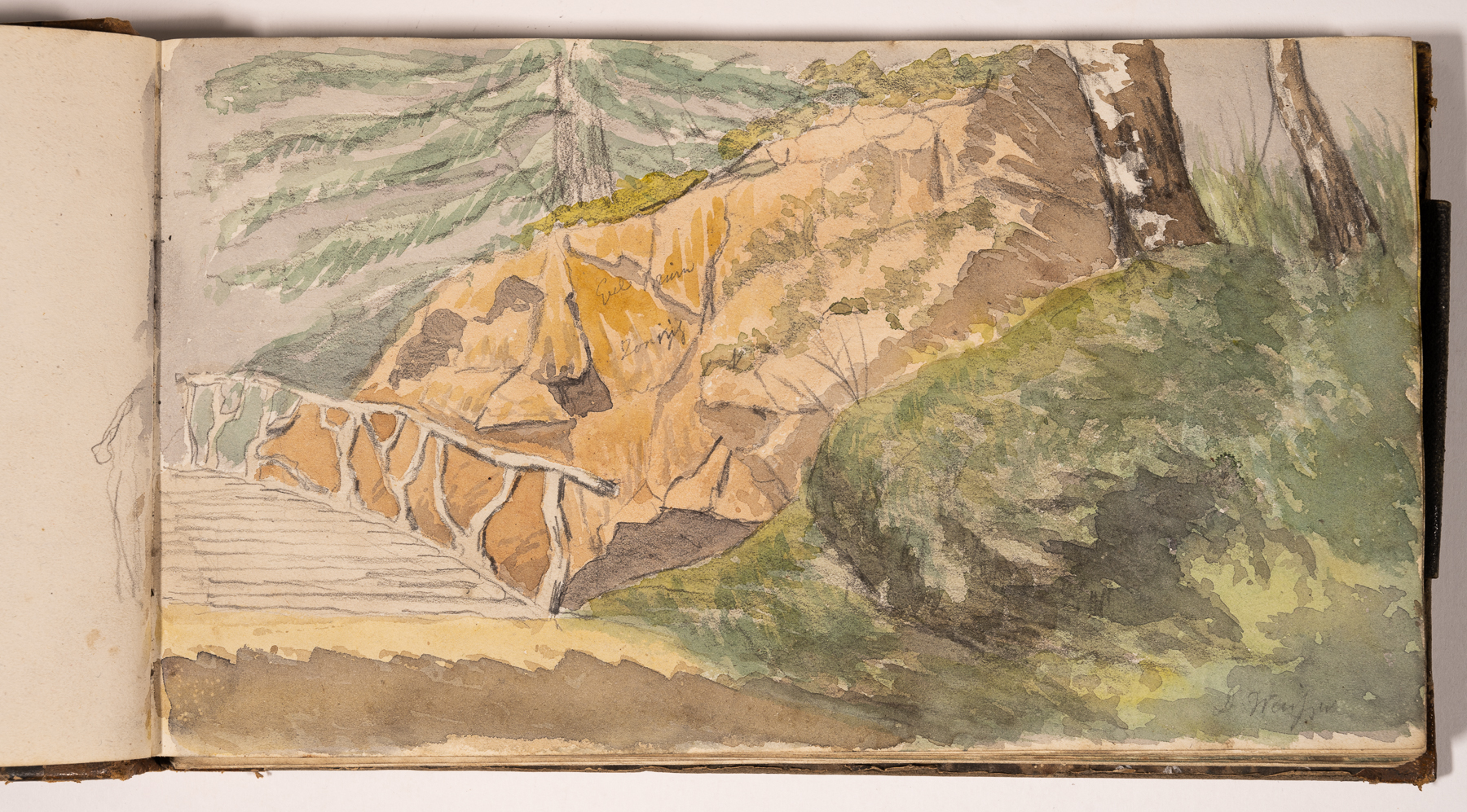 Das Skizzenbuch beginnt mit zwei Zeichnungen vom Rhein: Emmerich und das Siebengebirge bei Bonn. Dann beginnt die Reise in Schlesien: Die Wanderung geht von Reichenstein in der Oberlausitz und Weißwasser entlang der Reichensteiner Berge, weiter nach Niederschlesien. Das Skizzenbuch enthält viele Landschaftspanoramen der dortigen Berge. (Strehlener Berge, Eulengebirge etc.) Im hinteren Teil des Skizzenbuches sind in Bleistift einige Burgruinen am Rhein skizziert.
