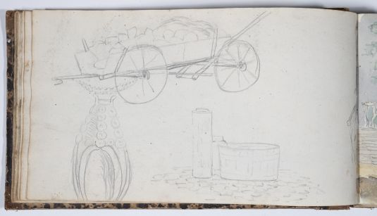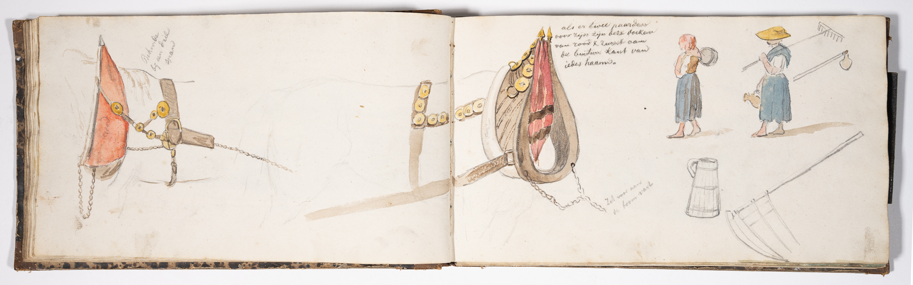 Motive: Figurenstudien, topografische Studien Oberlausitz und Niederschlesien, Rheinland (Burgen), Figurenstudien, Details von Möbeln und Gerätschaften, Pferdegeschirr und Wagen, einige Kopien nach niederländischen Kunstwerken