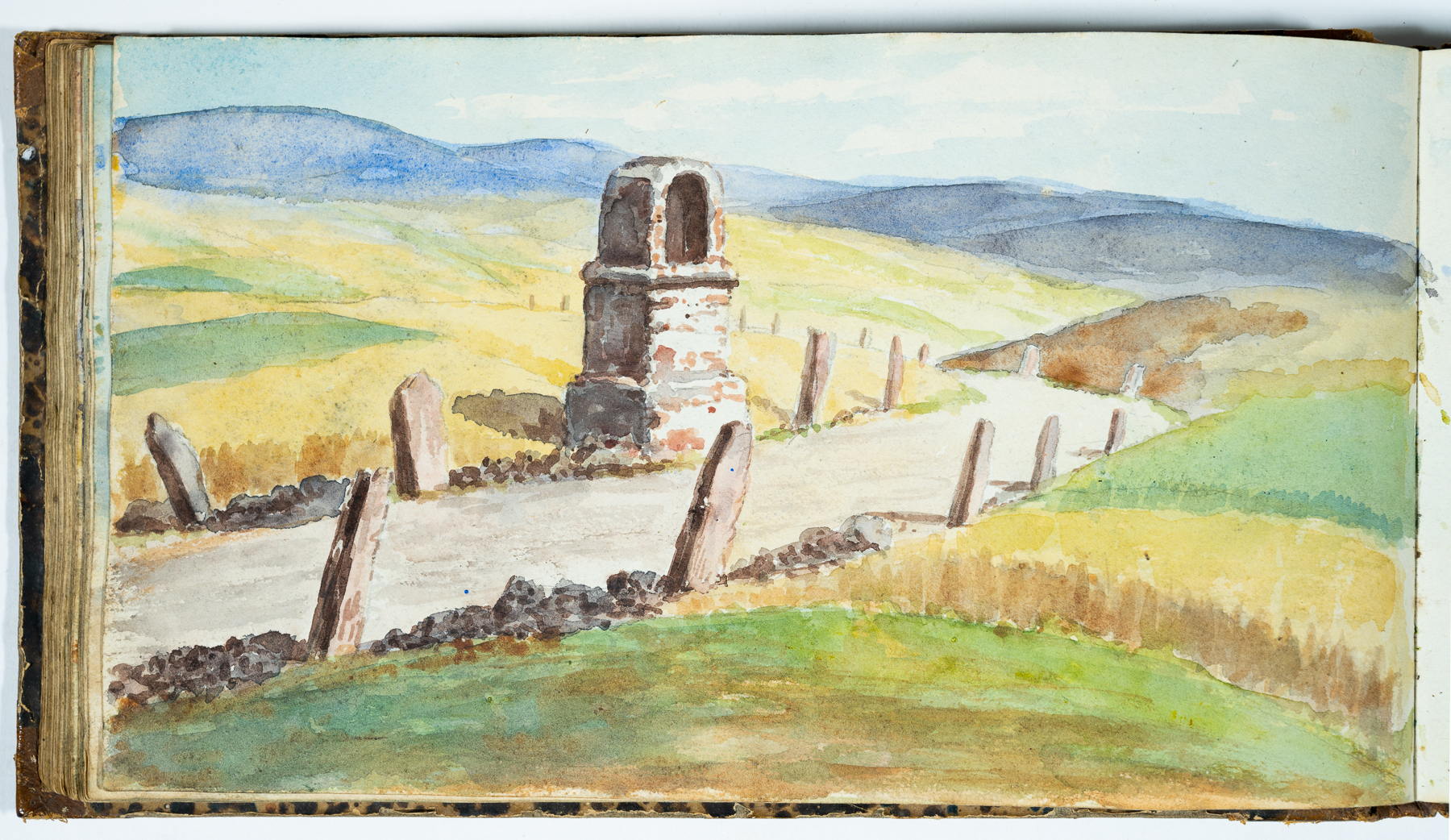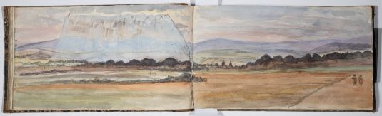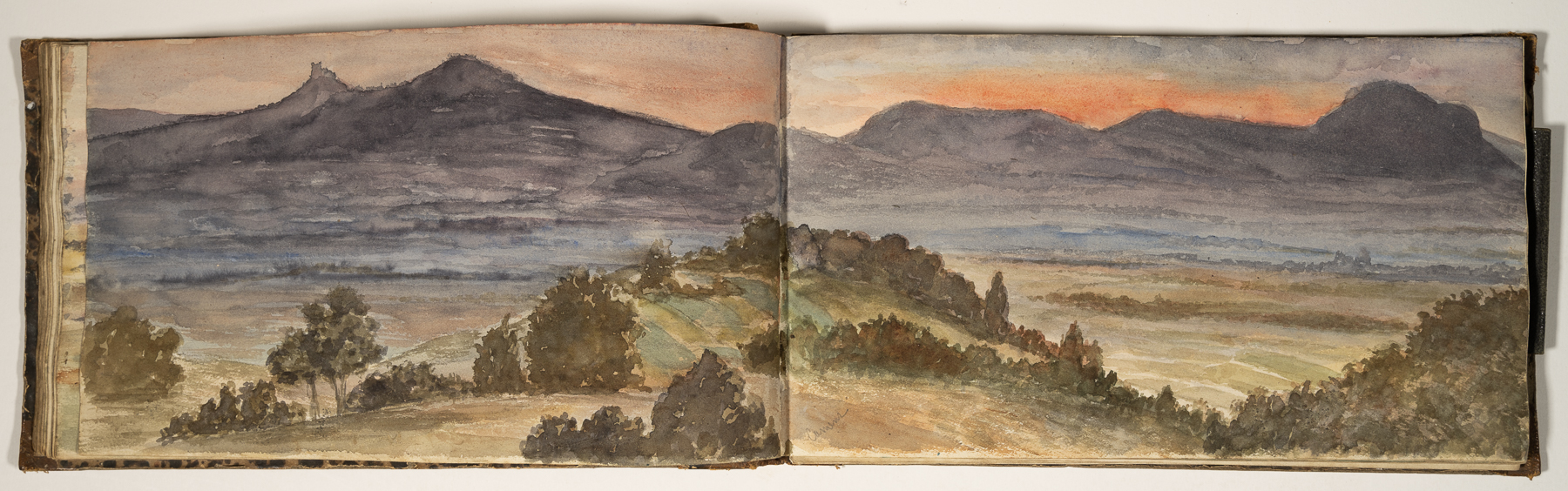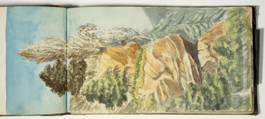 Das Skizzenbuch beginnt mit zwei Zeichnungen vom Rhein: Emmerich und das Siebengebirge bei Bonn. Dann beginnt die Reise in Schlesien: Die Wanderung geht von Reichenstein in der Oberlausitz und Weißwasser entlang der Reichensteiner Berge, weiter nach Niederschlesien. Das Skizzenbuch enthält viele Landschaftspanoramen der dortigen Berge. (Strehlener Berge, Eulengebirge etc.) Im hinteren Teil des Skizzenbuches sind in Bleistift einige Burgruinen am Rhein skizziert.