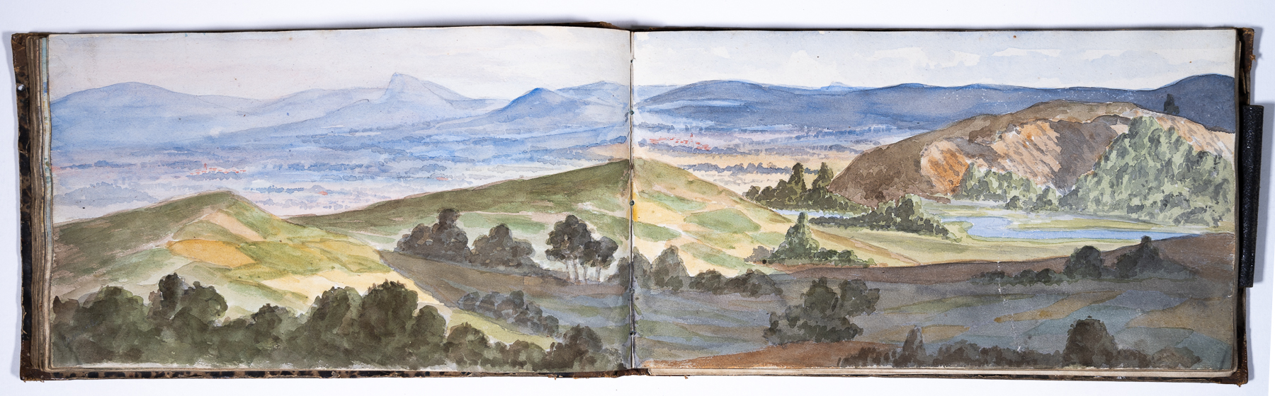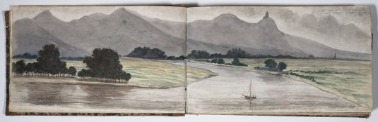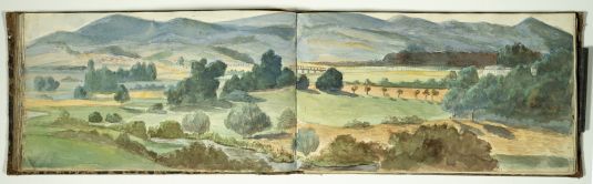 Das Skizzenbuch beginnt mit zwei Zeichnungen vom Rhein: Emmerich und das Siebengebirge bei Bonn. Dann beginnt die Reise in Schlesien: Die Wanderung geht von Reichenstein in der Oberlausitz und Weißwasser entlang der Reichensteiner Berge, weiter nach Niederschlesien. Das Skizzenbuch enthält viele Landschaftspanoramen der dortigen Berge. (Strehlener Berge, Eulengebirge etc.) Im hinteren Teil des Skizzenbuches sind in Bleistift einige Burgruinen am Rhein skizziert.