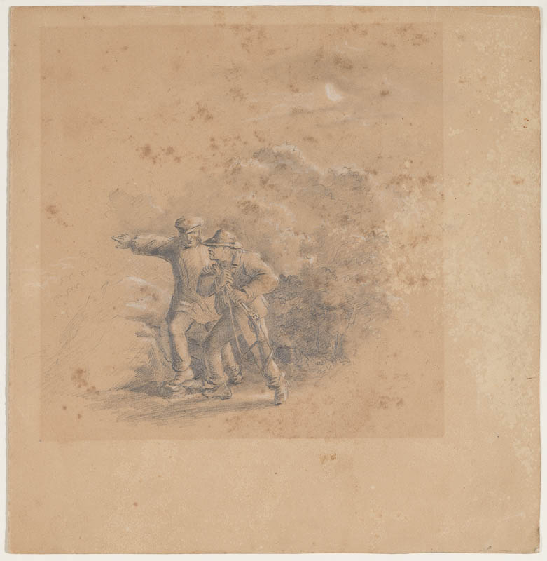 Ein Bauer zeigt bei Mondschein im Gebirge einem Mann mit Gewehr und Seil den Weg.