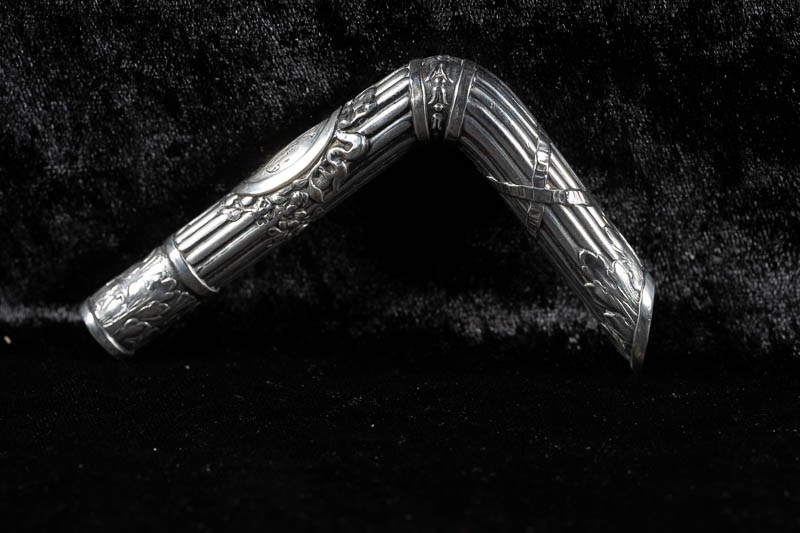 Rechteckig, gebogener Griff für einen Kindersonnenschirm; gerippt, mit gekreuzten und rechten Bändern; auf der Vorderseite reichumrahmtes Oval mit eingraviertem Monogramm CM (?).