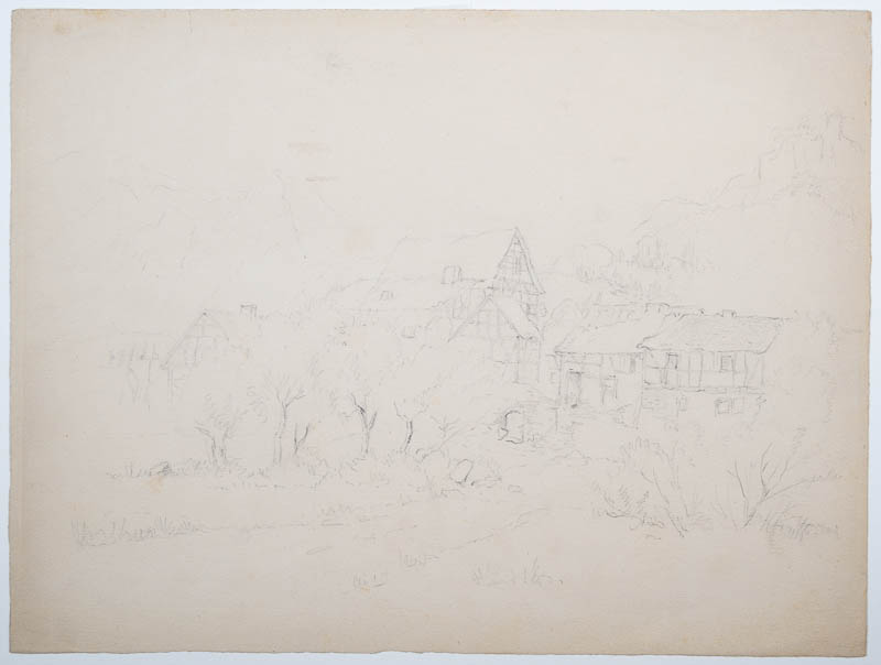 Häusergruppe (Fachwerkbauten) oder kleines Dorf in Felsenlandschaft; links und rechts steile Hügel, auf dem Hügel rechts steht eine Schlossruine.