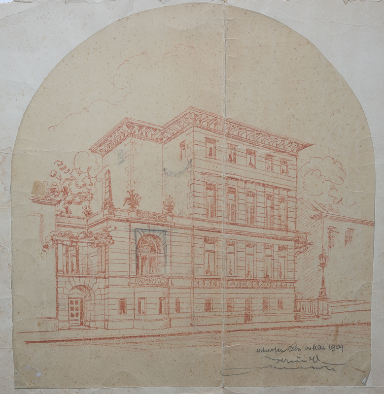 Ansicht der Fassade Haus Koekkoek mit einem geplanten Anbau (Architektenzeichnung); die Anbau wurde anders ausgeführt durch Otto van de Sandt.